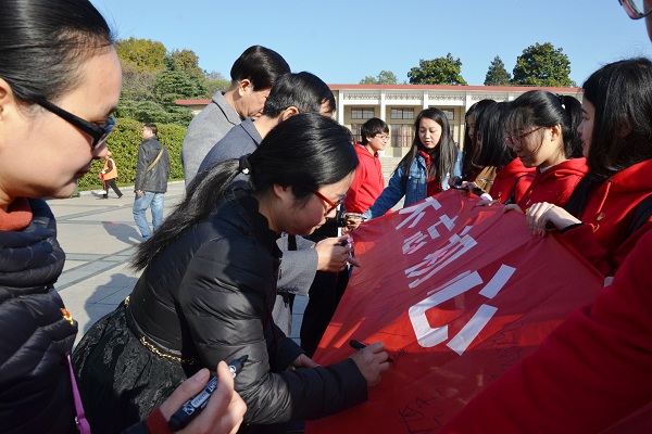 在烈士陵园主广场,鲜红的党徽在秋阳下熠熠生辉。研习社的同学们身穿统一服装,活动在庄严肃穆的气氛中开始。全体党员满怀崇敬与悼念之情,在“不忘初心、砥砺前行”横幅上庄严地签下自己的名字,全体党员重温入党誓词,铿锵有力的誓言,激励着每一名同志追寻先辈足迹,奋发图强,投身报国的理想和信念。随后的参观中,师生们详细学习了解了江淮烈士为革命事业抛头颅、洒热血的丰功伟绩。大家纷纷表示,通过缅怀先烈,使自己深受教育,在今后的学习、生活和工作中,一定要继承和发扬先烈们坚韧不拔、公而忘私、顽强拼搏、勇往直前的精神,按照“四讲四有”和“四个合格”的标准严格要求自己,真正发挥先锋示范作用。
