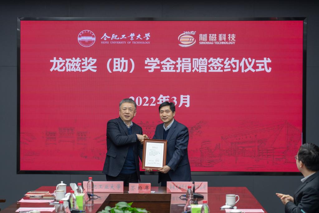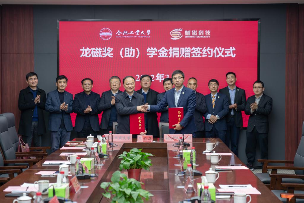 “龙磁奖(助)学金”捐资签约仪式在屯溪路校区学术会议中心举行。校党委书记余其俊同安徽龙磁科技股份有限公司总裁熊咏鸽等共同见证签约。校党委常委、副校长吴玉程向安徽龙磁科技股份有限公司颁发捐赠证书。校长助理、研究生院常务副院长刘心报,安徽智泓净化科技股份有限公司总经理熊延松出席签约仪式。