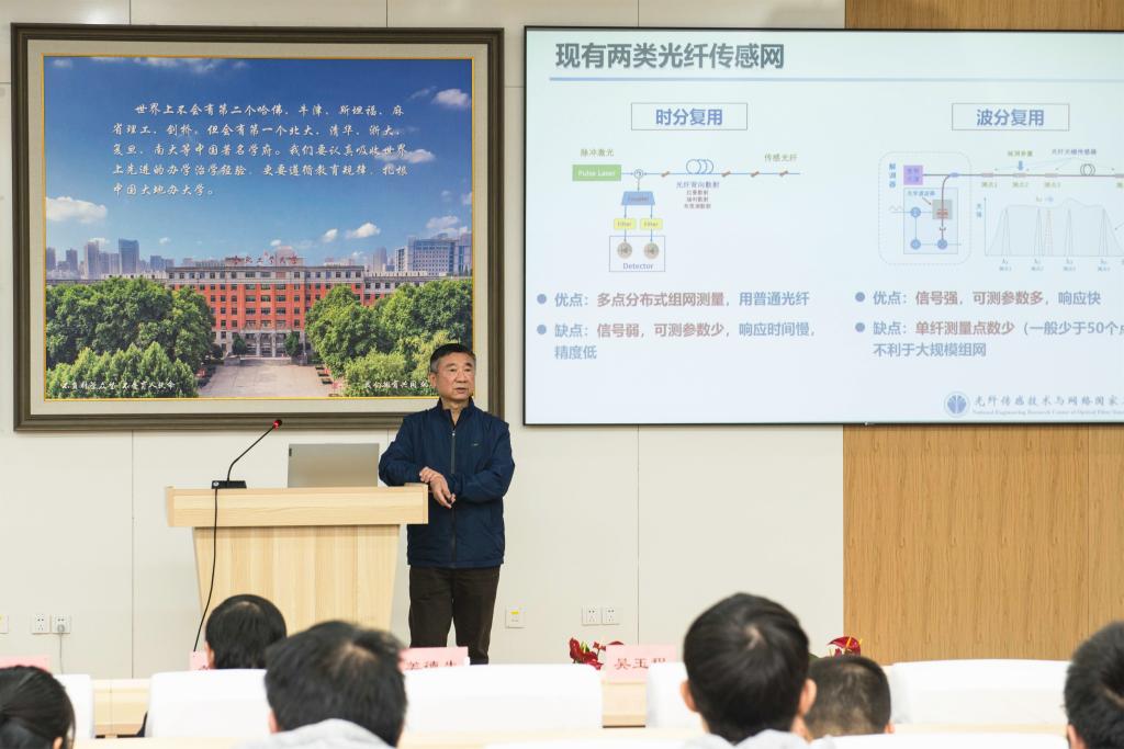 3月3日,中国工程院院士、武汉理工大学首席教授姜德生应邀来校,作题为“光纤传感网络智能复合材料与应用”学术报告。校党委常委、副校长吴玉程主持报告会。