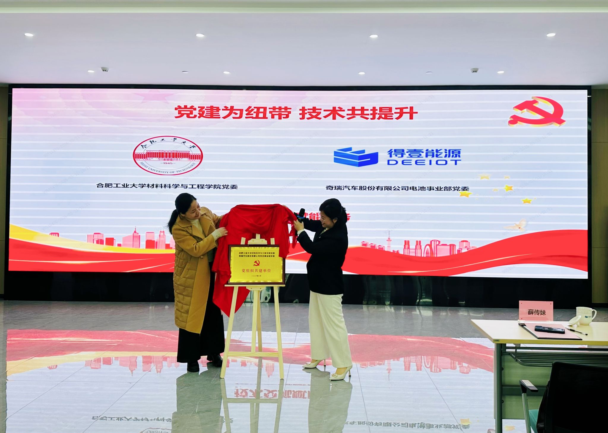 党委副书记薛传妹、奇瑞奇瑞汽车股份有限公司电池事业部党委副书记徐善红分别介绍了所在单位党建工作特色做法及成效,双方举行共建授牌仪式,并互赠纪念品。
