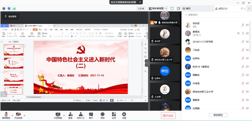 本科生第三党支部通过线上腾讯会议方式开展“党的十九大和确立习近平新时代中国特色社会主义思想为党的指导思想、决胜全面建成小康社会”党史主题集中学习活动。本次活动由预备党员崔德龙同志主持并进行党史授课,第三党支部全体成员(含预备党员)参加活动。