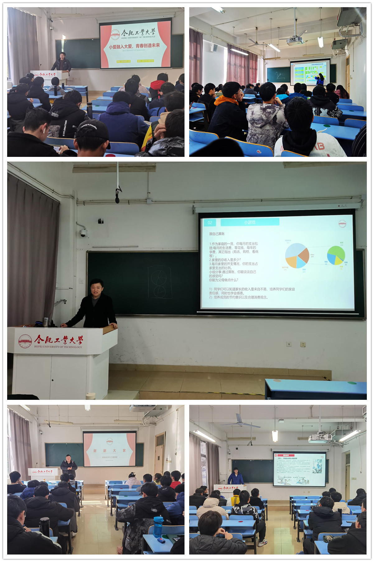 本次班会设PPT讲解、案例分析、视频观看、交流讨论、游戏互动等环节,分别从“关爱自我”“我爱我家”“爱校荣校”“爱党爱国”四个方面进行了讲解,教育引导全体学生学会爱护自己,树立自尊自爱、乐观进取的积极心态;爱家念家,促进对家庭的认识,发现家庭中的爱,学会感恩,处理好家庭关系,与父母和谐相处,向家庭成员表达自己的爱与感激之情;爱校荣校,明确使命、敢于担当,增强爱校主人翁意识,彰显工大学子的爱校之情、荣校之心、强校之行,用实际行动为母校的建设发展贡献青年力量;引导青年学生将爱党爱国之志付诸行动,将小爱融入大爱,把青春献给祖国。