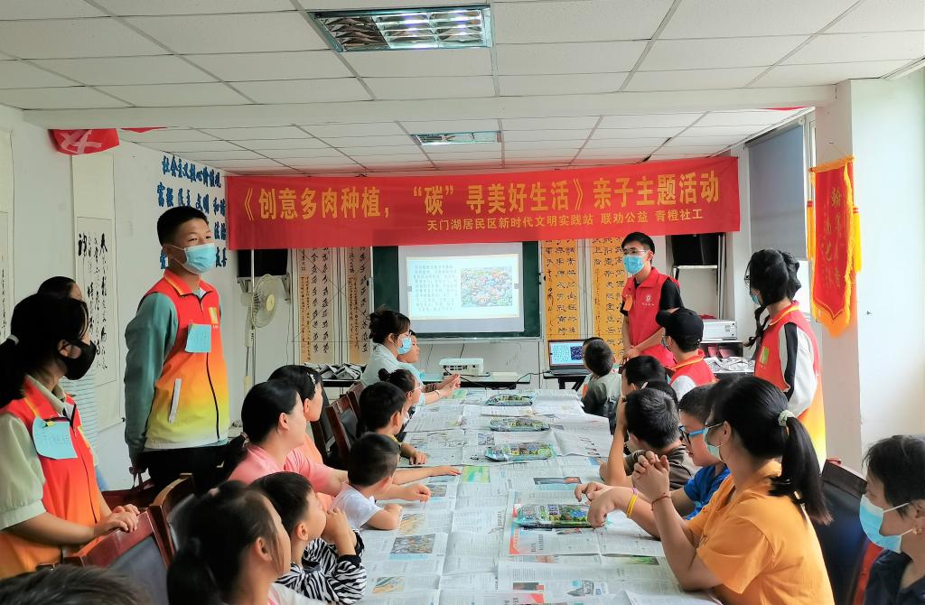 学生会权益服务部联合天门湖居民区新时代文明实践站、残疾人工作站、妇联联合青橙社工在天门湖居委会开展“创意多肉种植,‘碳’寻美好生活”亲子主题活动。