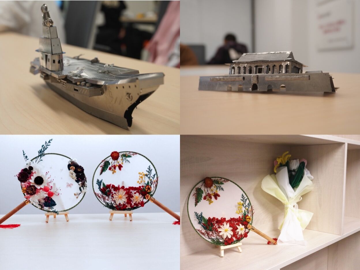 本次活动分为“艺模异样”手工模型制作和“艺花献祖国”花卉制作两个模块。在“艺模异样”手工模型制作模块,工作人员精心准备天安门、辽宁舰、唐灯等颇具中国元素风格的材料,同学们三两人一组,挑选心仪模型装备,通力合作完成制备,力求最大程度展现建筑之美。制作完成后,同学们手举模型,向祖国母亲表达真挚的祝福,由衷庆贺祖国母亲73周年华诞,表达了自己对于未来的美好期许和不懈奋斗的决心。材料物理专业李成同学说道:“有一份热,发一份光!大学阶段我将以工业报国之心,立工业报国之志。做到‘日日新,苟日新’向内自省,牢记‘闲居非吾志,甘心赴国忧 ’的理想,走向‘大鹏一日同风起,扶摇直上九万里’的未来!”