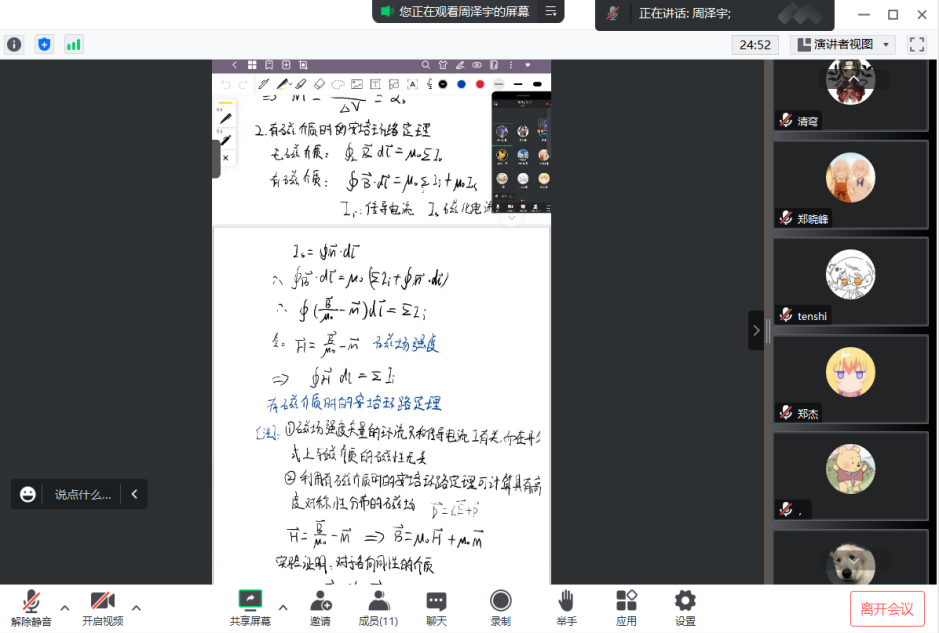 “在线小讲堂”主要教授内容为《概率论与数理统计》《大学物理B(下)》两门通识教育必修课。活动前期,学院在线上公开招募讲师团成员,共计选拔6名朋辈讲师参与线上小课堂活动。朋辈讲师在授课前认真制定教学计划,集体备课,做好充分授课准备。活动过程中,讲师们针对课程基础知识和常考易考例题,帮助同学们梳理知识架构、查漏补缺。课堂的交流环节中,小讲师也耐心地解答同学困惑,营造良好的线上课堂氛围。为适应不同同学的学习节奏,学院同时开展“线上自习室”活动,以腾讯会议为载体,以高自由度为原则,鼓励同学们自行规划学习。同学们每日进入会议后便自行安排复习,自习室里浓厚的学习氛围在一定程度上起到督促作用。