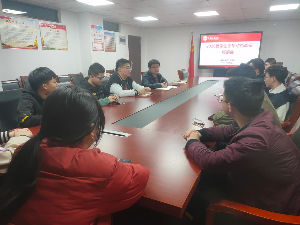 2020级顺利完成春季学期学生返校思想动态“大调研”工作。本次调研通过召开学生干部座谈会、学生党员座谈会、学生代表座谈会、问卷调查、走访寝室、谈心谈话、开学第一课等多途径多方式开展,全面深入了解学生思想动态。