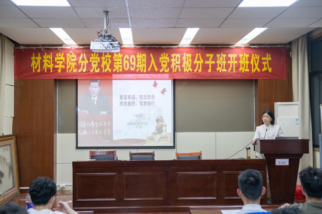 开班仪式结束后,学院党委书记、分党校校长吕珺为全体学员作《重温寄语、坚定信念 勇挑重担、筑梦前行》专题党课。带领同学们重温习近平总书记对当代青年的系列寄语。从一句句温暖的话语中,不断坚定理想信念。吕珺老师在党课中强调,学员们要厘清自己的入党动机,坚定理想信念;要“立鸿鹄志,做奋斗者。”;要在“长风破浪”中勇担时代重任;要在奋进之路上争做先锋,敢做模范,筑梦前行。并结合学院学科特色,介绍了一批材料领域的杰出校友,勉励同学们要秉承工业报国初心,传承红色基因,为实现科技强国,工业报国作出应有贡献!