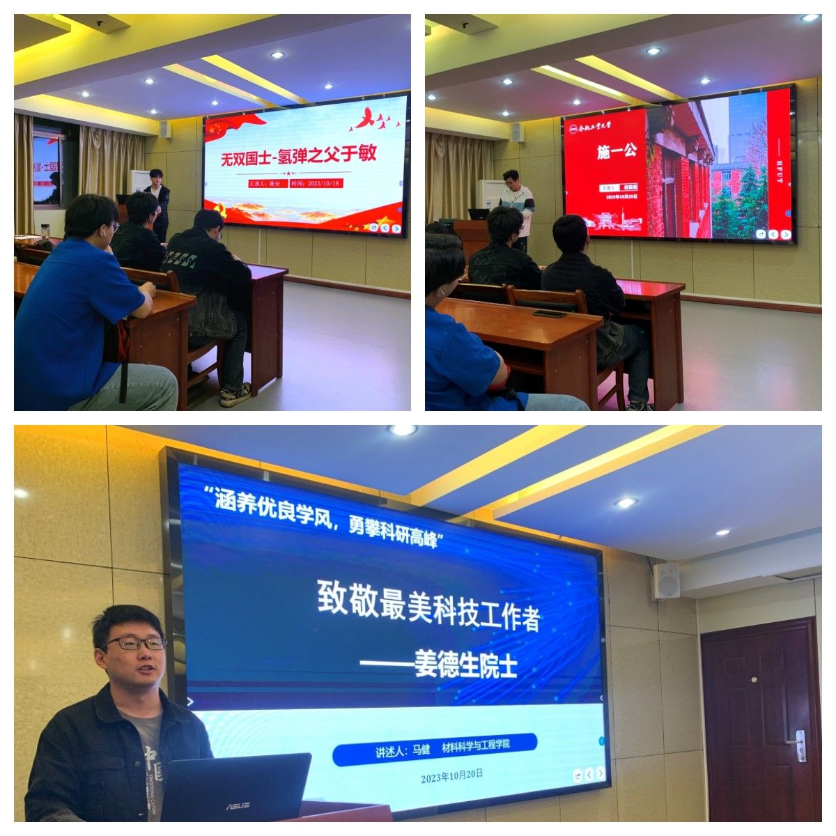 会上,三位同学分别介绍三位科技工作者的事迹以及背后蕴含的科学家精神,通过互动交流,学习和继承协同合作和追求真理的科学家精神。陈安同学讲述了氢弹之父于敏老先生的事迹。于敏老先生28载隐姓埋名,艰辛研制氢弹,填补了中国原子核理论的空白,为氢弹突破做出卓越贡献,荣获了“两弹一星”功勋奖章,国家最高科学技术奖等崇高荣誉。于敏老先生打破国外重重封锁,依靠自己勤奋努力举一反三进行理论探索的科学家精神值得我们学习。赵强强同学介绍了施一公先生。施一公先生是中国科学院院士、美国国家科学院外籍院士、欧洲分子生物学学会外籍会士、现任西湖大学校长。在美国生活了十八年的施一公面对广阔的事业发展前景,优越的生活条件毅然决定回国,回到母校清华为中国科技和教育体制的进一步发展付出更多。马健同学介绍了姜德生院士。姜德生院士是武汉理工大学首席教授,光纤传感材料与传感技术专家。在新世纪初光纤光栅材料核心部件技术掌握在外国手中的背景下,打破中国国外技术封锁,形成了具有中国自主知识产权的成套生产技术与设备,为中国众多行业与重大工程及军工提供了急需的新一代传感技术。