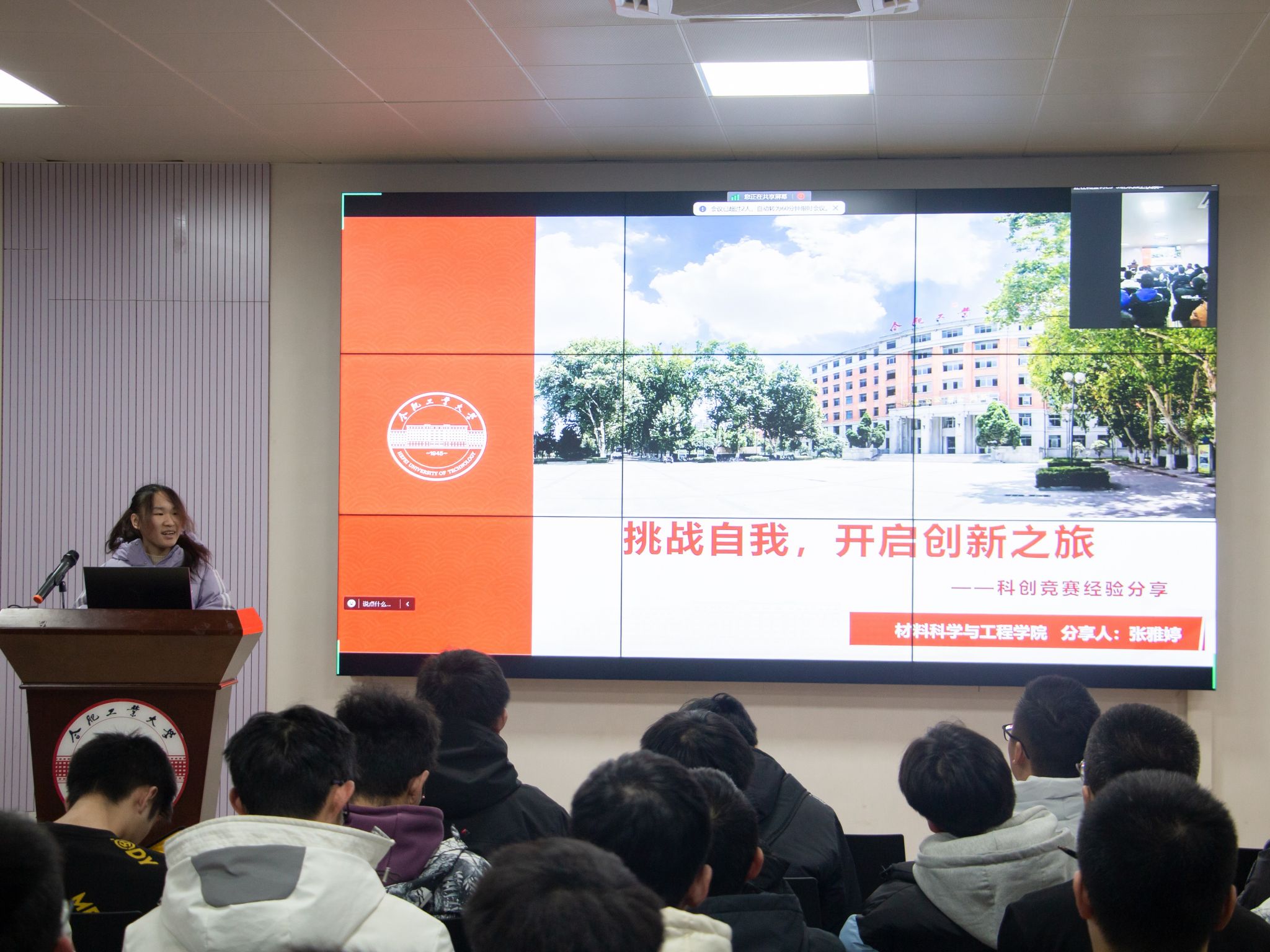 活动中,结合安徽省A/B类赛事和独播库 学科特色和优势,独播库 大学生科创中心精选大学期间部分常见赛事,围绕赛事基本信息、比赛内容、参赛途径、参赛意义和信息获取平台等方面展开详细介绍。随后,学院2020级优秀本科生张雅婷、康雯祺从自身参赛经历入手,分别就“大学生创新创业训练计划”“‘互联网+’大学生创新创业大赛”进行经验分享。按照赛事参与流程,两人依次从选题思路、项目构建、团队组建、项目撰写、答辩考察、实践凝练等环节进行讲解;通过实际案例的展示分析令现场同学对科技创新竞赛有了更为生动的认识。互动环节中,同学们踊跃提问,宣讲人员一一做出了详细的解答。活动最后,张雅婷说道,科技创新竞赛既是一场挑战,也是一场机遇,更是大学生活中一段难以忘怀、共同奋斗的精彩章节,鼓励同学们通过自己的努力,用力参与,用心体验,创造更多的可能、遇见更好的自己。