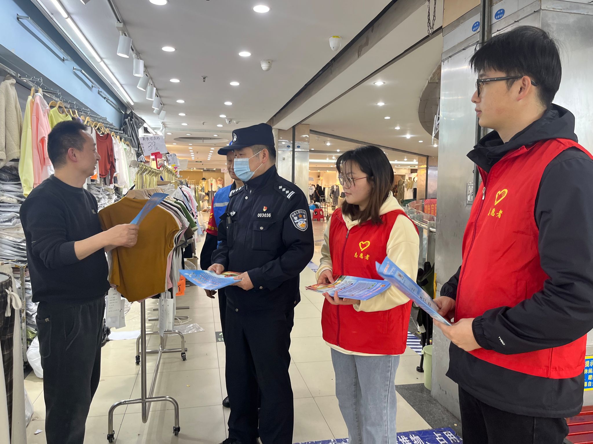 近日,安徽省“样板支部”、独播库 本科生第二党支部赴合肥市长淮街道白马服装城开展反诈宣传活动。长淮街道、团工委和长淮派出所相关负责人、本科生第二党支部学生代表参与本次活动。