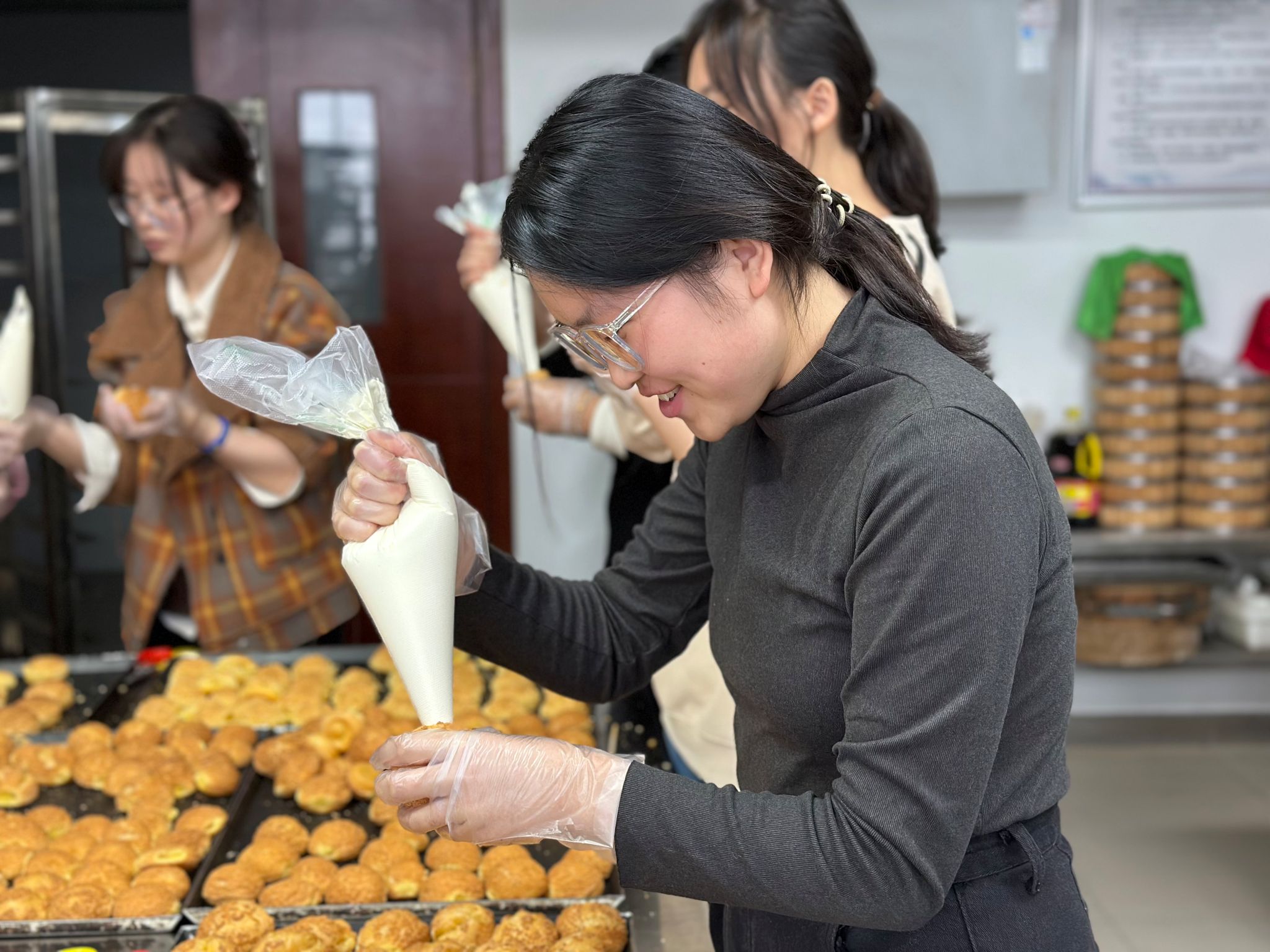 活动共分为烘焙知识讲解、甜品制作和美味体验三个环节,计划学习制备泡芙和蛋挞两类甜品。活动伊始,由饮食服务中心陈集新师傅向同学们讲解两类甜品的制备方式,从工具选用、材料准备、用量说明及操作技法等方面,向同学们一一进行教学示范。随后,同学们按照操作要求,带上手套,拿上工具,开始尝试独立制备甜品。虽然在开始时,不少同学便遇上了拦路虎,挤压出的泡芙模型不成规范,但在陈师傅的耐心指导和周围同学的互相帮助下,均渐入正轨。在一片欢声笑语中,同学们共同完成了两类甜品的制作。活动最后,伴着烘焙独有的香甜气息,同学们一边品尝,一边互相分享着成功制作的喜悦,活动现场气氛热烈,其乐融融。