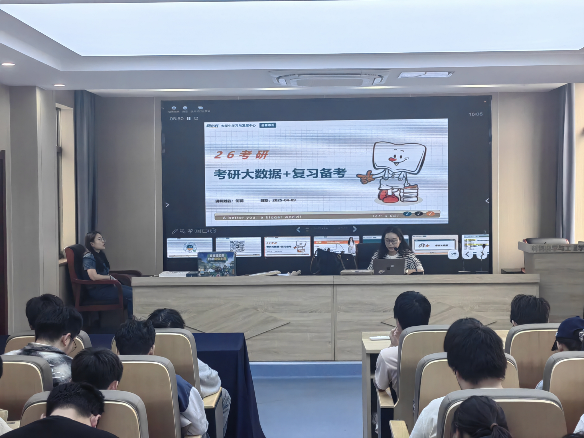 邀请新东方合肥中心产品经理何蕊,为考研学子开展考研择校及英语备考指导讲座。讲座围绕全国考研大数据分析、择校择专业策略、学科复习经验等核心内容展开,帮助同学们更科学地规划考研择校、复习等问题。学院2026届70余名本科生同学参与了此次讲座。