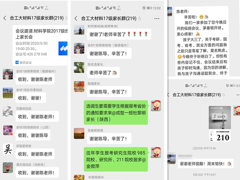 学生家长的一封信》,希望各位家长借助本次疫情加强孩子的生命教育,增强孩子的自我保护意识,线上学习期间尊重孩子的独立独处,帮助孩子营造良好的家庭氛围,理解孩子的负面情绪,协助孩子改善情绪,培养积极心态,指导孩子规律作息,提高自我学习管理能力,强化身体锻炼,助推家校联动机制,共同做好孩子的培养教育管理工作;随后,年级辅导员围绕近4年全国研究生考试报名人数变化、录取比例变化情况,学院近3年研究生招生考试录取情况,公务员考试时间节点,学校近4年组织大、中型招聘会及企业宣讲会情况向家长们做了简单介绍,帮助学生家长及时了解当前的就业形势,指导他们根据时间节点合理督促引导学生做好时间安排,抓住就业时机,为即将到来的就业工作做好充足准备。持续1个多小时的线上“云家长会”反响良好,赢得了家长们的一致称赞和好评。