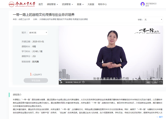 据悉,“一带一路上的器物文化传播与创业意识培养”线上慕课计划于2020-2021学年第1学期在校级慕课平台向全校开放。截至目前,该慕课线上平台课程已搭建完成,向学校提交了线上慕课开课申请并获批,学院已将该门课程作为必修课程纳入本科生2019版培养计划。下一步,教学团队将充分发挥自身思想政治教育优势,立足课程思政进一步打造线上精品课程,围绕课程教学实践环节,结合第二课堂打造“器物之美”实践育人品牌,激发学生的学习兴趣,提高学生学习的独立性与创新性,为政工干部队伍拓展思政教育平台、渠道,更好融合两个课堂协同育人做出有益尝试。