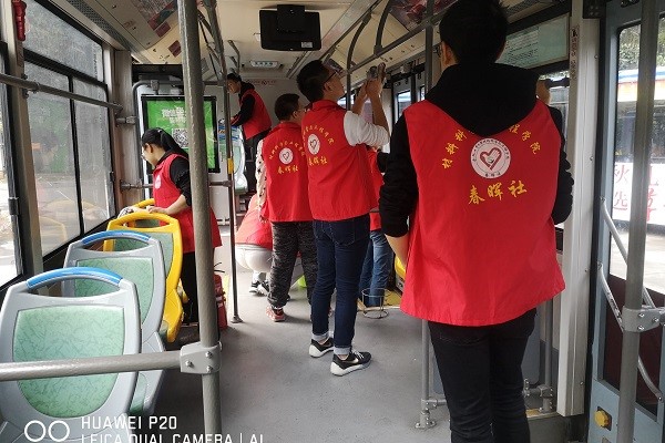 活动伊始,春晖社志愿服务部负责同学就本次志愿活动做了简单的分工和安排。随后,就公交清洁活动中的基本问题向公交站的工作人员做了现场咨询和了解。清洁现场秩序尽然,志愿者们有的清理座位下的死角,有的清理车厢地板,有的清理车体污渍,有的清理车窗。对一些卫生死角如空调出风口,窗槽,行李架等地方的灰尘也进行了全面清扫。同时,在车辆进出站的高峰时段,志愿者们以快捷、高效的方式确保了每一辆公交车的按时按点使出站台。长达4个小时的志愿清洁活动结束了,志愿者们脸上露出了灿烂的笑容。