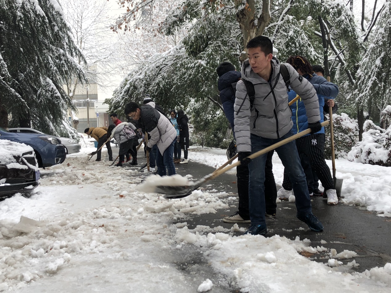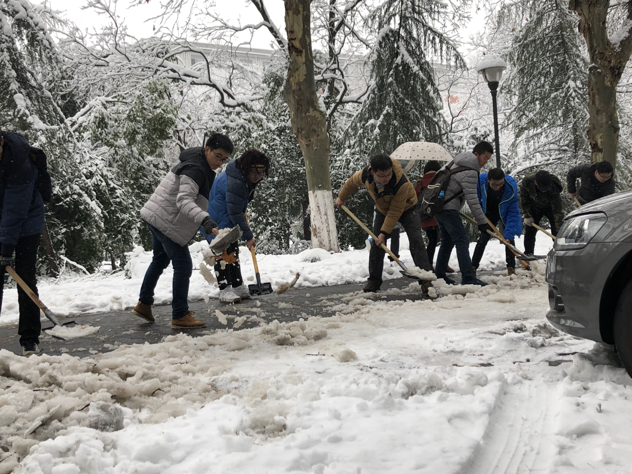 2015级本科生党支部的学生组成志愿小分队,从行政楼借来工具,火速加入到除雪队伍中去。所有学生分成两组,分别从至善路的两端开始除雪,将路中间的雪堆积到道路两旁,并将停车位前的积雪堆到不妨碍车辆进出的位置。辅导员周矗老师身先士卒,同学生一起劳动,在冰冷的雪地里,同学们丝毫没有怠慢的情绪。经过一个半小时的努力,至善路已经可以正常通车行走。