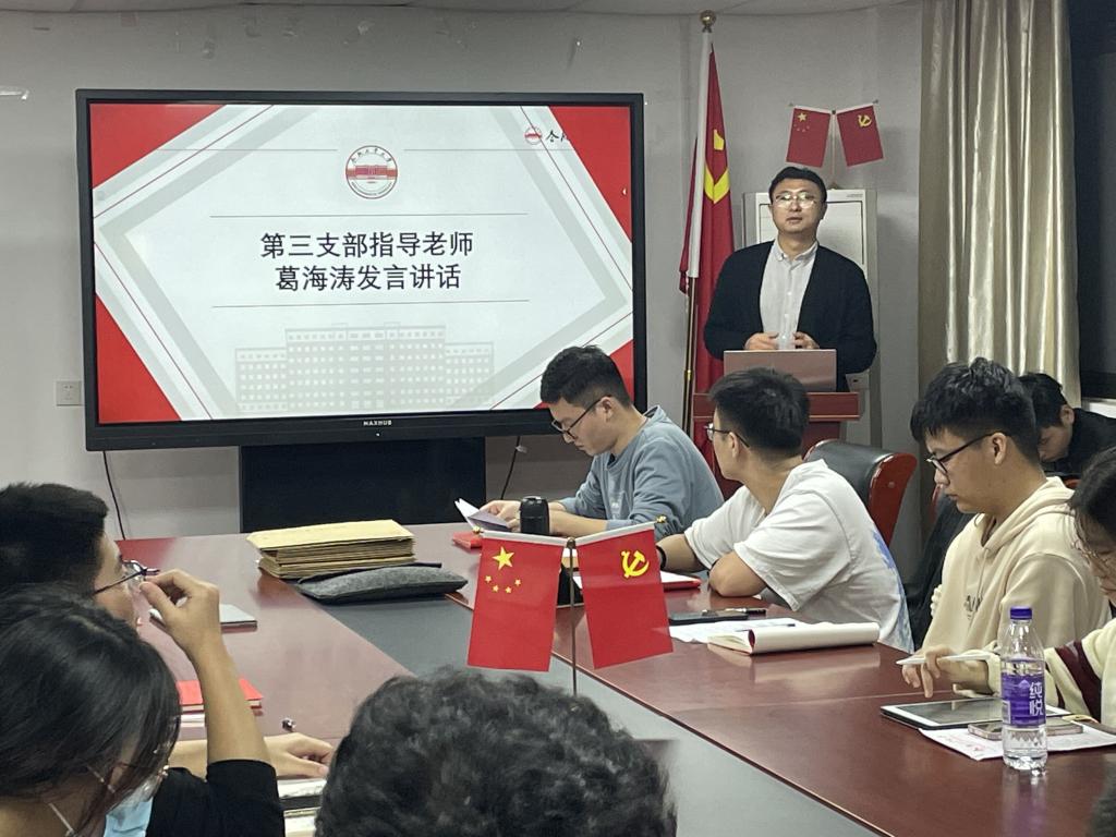 最后,本科生第三党支部指导老师葛海涛做了总结发言,他强调入党不是结束而是新的开始,在今后应该更加严格地要求自己,注意自身言行举止,时刻以党员标准要求自己,努力学习党的理论知识,提高自身政治素养,与新时代同向同行,在党的旗帜下,将青春融入党和人民的伟大事业。