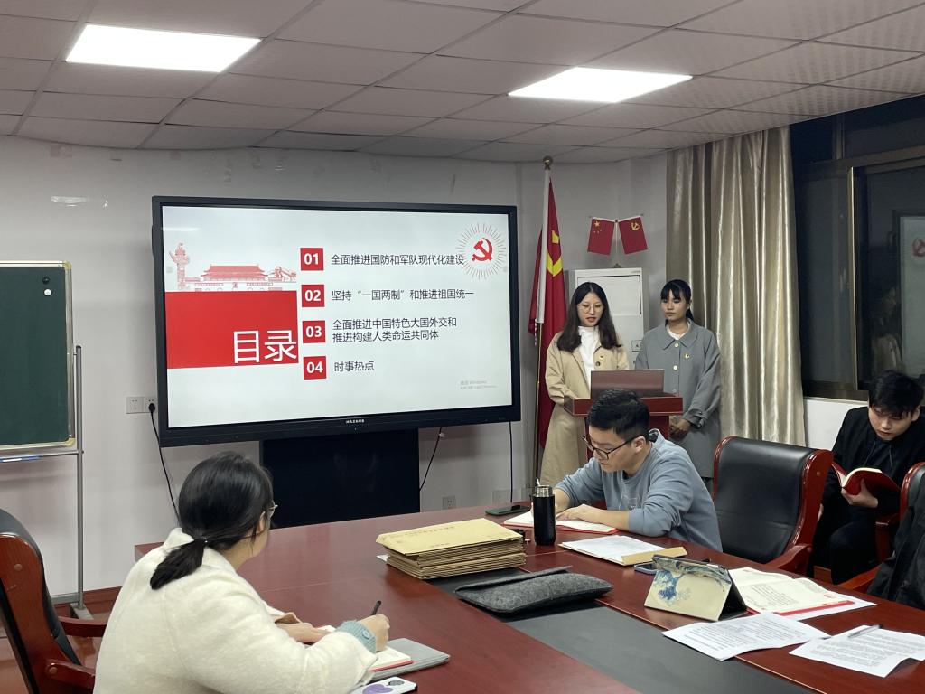 大家首先学习了全面推进国防和军队现代化建设、坚持“一国两制”和推进祖国统一重要思想、全面推进中国特色大国外交和推进构建人类命运共同体等三个主要方面的内容。在学习习近平总书记关于海峡两岸统一讲话中,学习了坚持一个中国原则和“九二共识”,认识到祖国的和平统一不但是领土上的和平统一,还需要有思想上的和平统一。支部成员针对学习内容进行了讨论分享,成员们积极参与,现场气氛活跃。