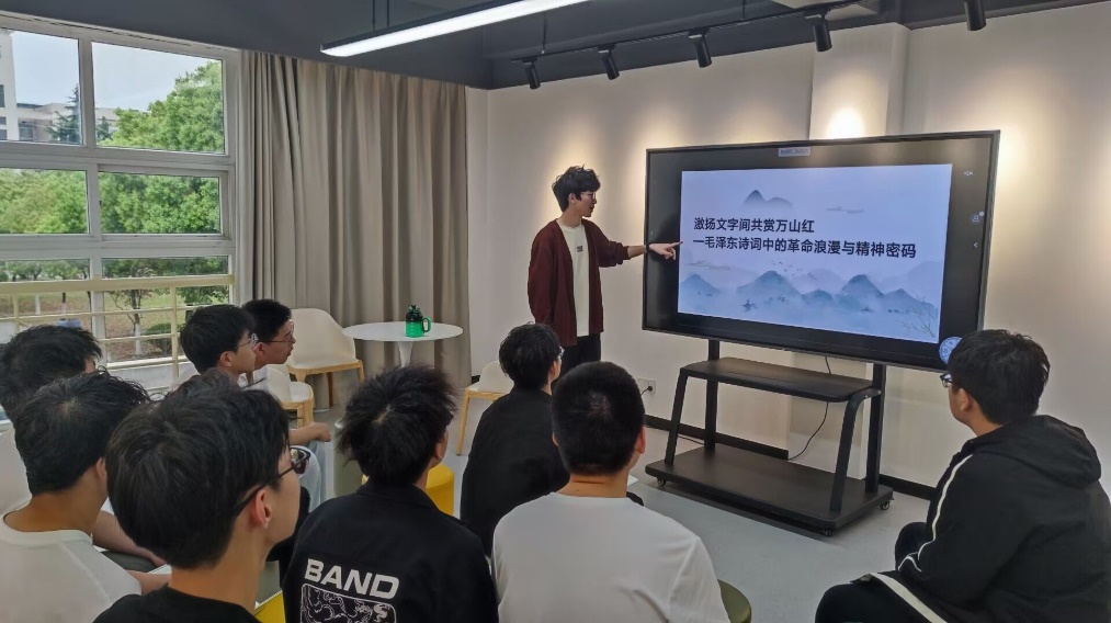 在翡翠湖校区四号学生社区沙龙空间举办“激扬文字间,共赏万山红——毛泽东诗词中的革命浪漫与精神密码”读书分享会。学院“百川归海,墨韵流芳”读书小组全体同学参加本次活动。