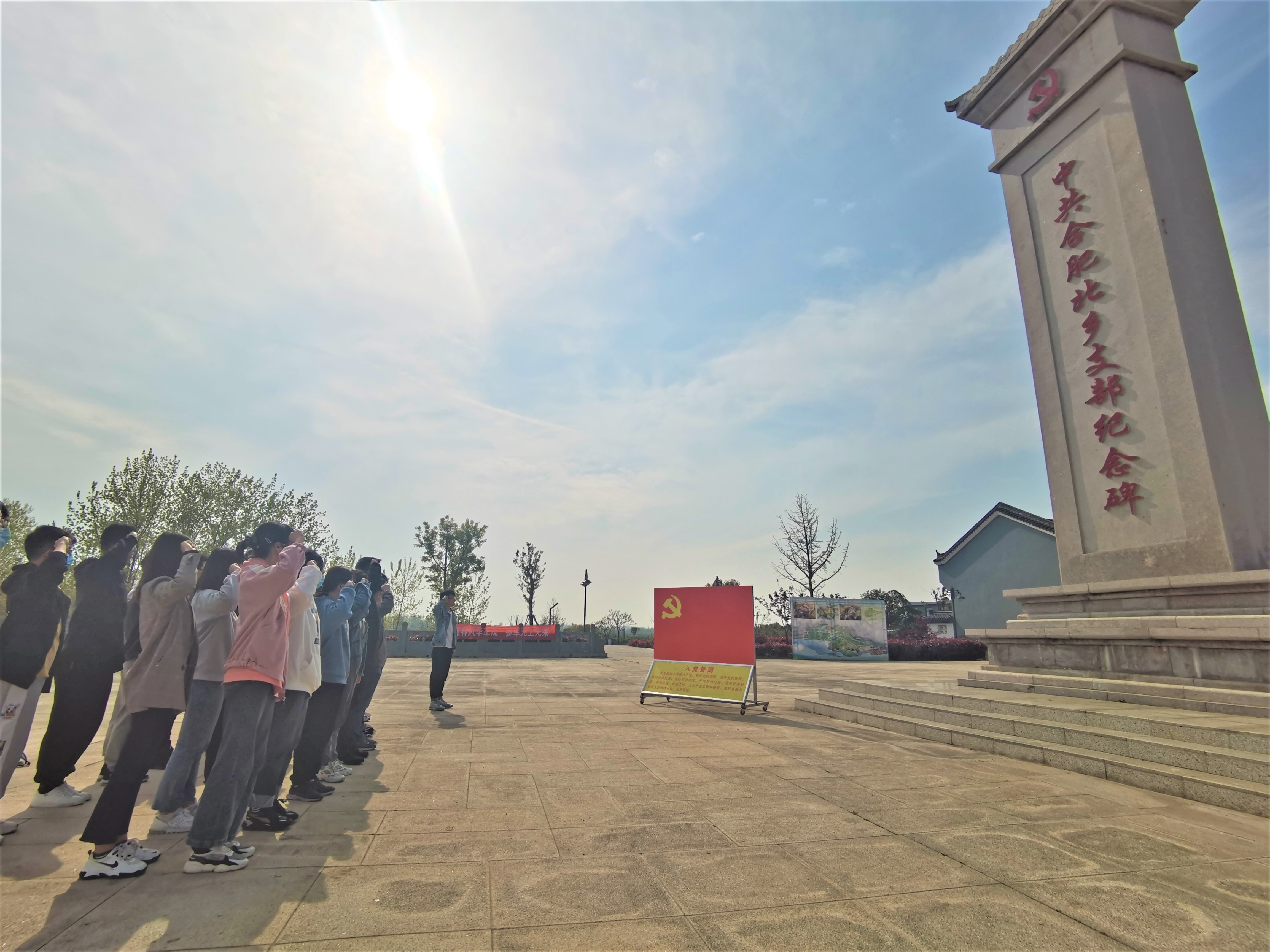 同学们首先来到纪念广场,拾阶而上,映入眼帘的是竖立在广场中央的一座庄严纪念碑,怀着崇敬的心情,在纪念馆负责人耿言林的介绍下,瞻仰纪念碑,重温党史,认真了解中共合肥北乡支部的创建历史背景及支部革命的光辉历程。在革命烈士纪念碑前全体党员进行集体了宣誓,重温入党誓词。