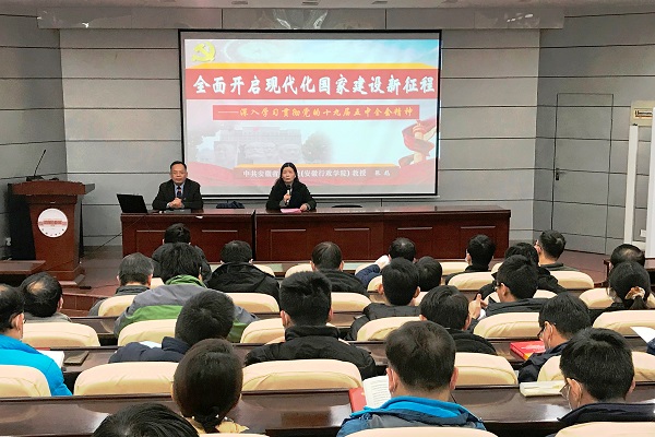 在斛兵报告厅举行十九届五中全会精神学习专题报告会。中共安徽省委党校决策咨询部主任、省委党校党的建设与国家治理研究院执行院长张彪教授应邀作了题为“全面开启现代化国家建设新的征程——深入学习党的十九届五中全会精神”专题宣讲。全院教职工、部分学生党员干部参加学习。